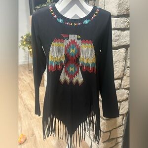 🆕NWT Savanna Jane Ranch Black Fringe Tunic With Beaded Thunderbird
