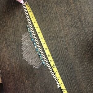 B&J COUTURE Statement short necklace with irridescent burned crystals AB rhinestones (blue and green shades) and gold tone chain fringe