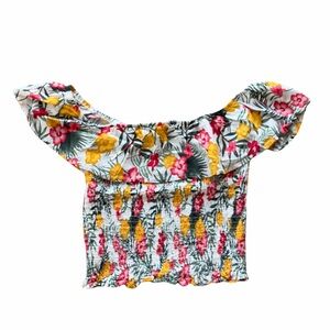 Bright floral crop top with ruffle sleeves. Features pink, yellow, and green pattern. Perfect for casual wear.