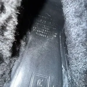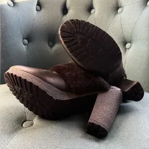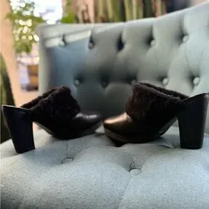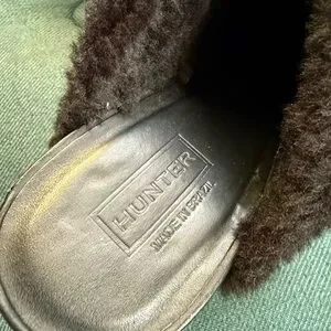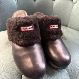 Hunter ‘Bruson’ black mule heel with a cozy faux fur trim. Stylish and comfortable for any outing. Genuine leather upper, genuine Brazilian sheepskin lining, rubber sole. Women’s size 10.