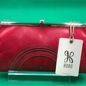Chic HOBO Lauren clutch in vibrant cherry red grenadine color. Features intricate detailing and a sleek clasp closure. Ideal for adding flair to any outfit.