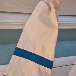Stylish white lab coat featuring blue and fuchsia stripes.