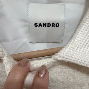 Chic white button down shirt by Sandro. Features short sleeves and a classic collar. Ideal for stylish outings.