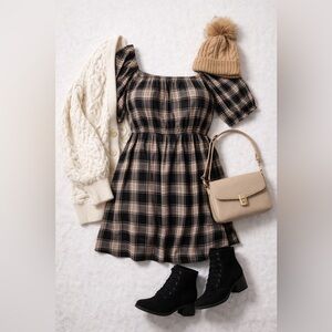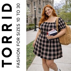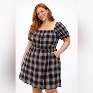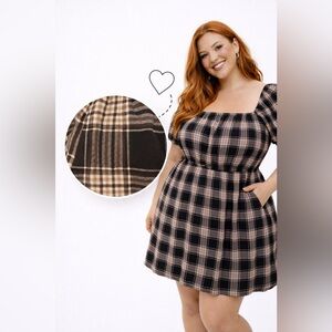 Torrid Black & Brown Plaid Puff Sleeve Mini Challis Dress, Large, NWT!