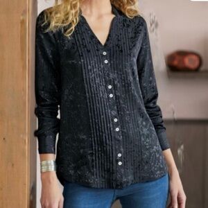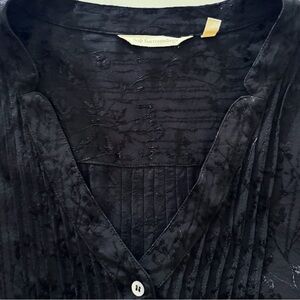 Soft Surroundings Sistine Floral Embroidery Jacquard pintuck in black. V-neck, button down. 100% viscose. Good used condition. Size 3X, measurements laying flat 28” pit to pit, shoulder to hem 27.5” in front 30” in back. Stock photo included to help show pattern/detail.