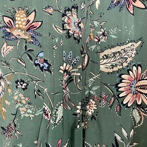 Charming sage green midi dress with floral pattern. Short sleeves and relaxed fit. Pintucked bodice and center back. 100% rayon. Size Medium.