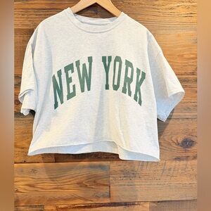 Brandy Melville/John Galt Aleena T-ShirtThis tee features a custom artwork “New York” graphic, short sleeves, and a crew neckline. Boyfriend fit for an oversized look and slightly cropped raw hem. size small. Pls refer to approx measurements below (laid flat),