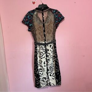Chic midi dress by Byron Lars. Features floral and geometric patterns. Short sleeves with a V-neckline. Ideal for a stylish look.