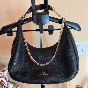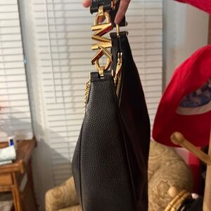 Heavily decorated with gold-toned hardware. Flashy and sophisticated works with all your outfits, formal and business. The bottom of the purse has a very small white granule spot on one bottom corner that are shown in the photographs. Very hard to see. Immaculate interior, one zipper pocket and one slip. The zipper is attached to the gold chain whose opposite end is attached to the shoulder strap.