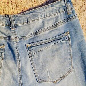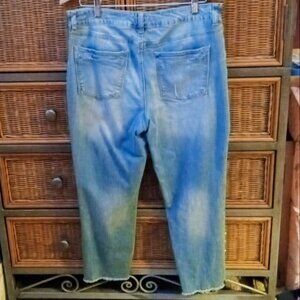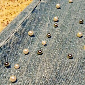 This is a pair of Maurices cropped capri style denim jeans with pearl and silver-tone stud embellishments and a frayed ankle hem. The jeans feature a classic blue hue with a stylish cropped ankle length, perfect for a casual yet chic look. The denim showcases a light to medium wash with intentional natural fading and distressing, adding a trendy, lived-in vibe. Ideal for pairing with your favorite tops and shoes for a versatile wardrobe staple. Barely worn; excellent condition; smoke free home. 98% cotton, 2% spandex, machine wash. Zipper and button closure, five pocket style, belt loops. Tapered at ankle; very comfortable!