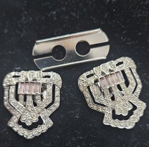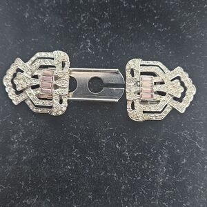 Beautiful vintage Art Deco rhinestone duette, circa 1930s–1940s. This piece features two matching dress clips that detach from the original duette frame, allowing it to be worn together as a brooch or separately as individual clips — a highly collectible and versatile design.