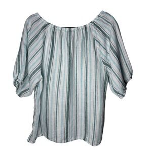 Talbots 100% Linen Striped Peasant Top L Teal Green Split V-Neck Boho Coastal
