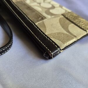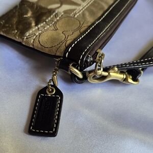Elegant Coach wristlet with a stylish gold and brown patchwork. Perfect for carrying essentials.