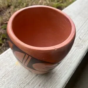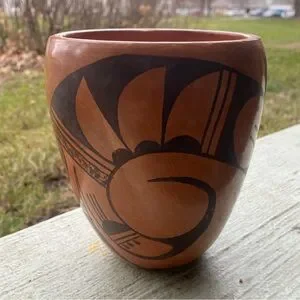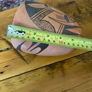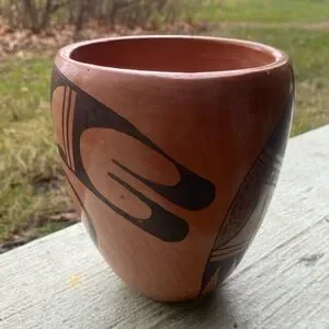 This amazing vintage pottery vase has been beautifully crafted by Hopi potter Frieda Poleahla (1918-1994). It is 6" tall by about 4.5" across. This piece is signed on the bottom by the artist (her pottery is valued by collectors — One of Frieda's pieces is in the Smithsonian Museum collection). It is a traditional hand-coiled hand-painted vase. There are a few faded wear spots, a small scrape on the side, and a small indentation on the rim. Smoke - free home.