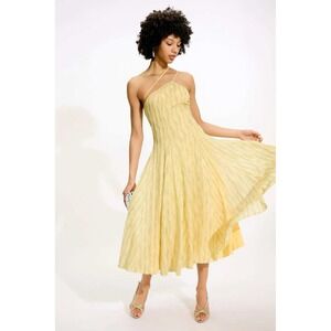 Asymmetric midi dress crafted from a textured knit with metallic silver lurex threading in a wavy vertical pattern. This sun-drenched yellow piece features a unique one-shoulder neckline with a thin diagonal strap and a playful cutout at the back. The fit-and-flare silhouette is enhanced by a pleated skirt that creates beautiful movement. Note: There is a small visible snag/hole in the knit fabric on the right hip area as shown in the photos.