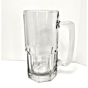 This product is a large 32 oz heavy glass beer mug, standing at 8 inches tall and with a 4-inch diameter with 9 panel design. It features a clear color and falls under the theme of Breweriana collectibles. Perfect for enjoying your favorite brews or displaying as a piece of collector's item in a bar or man-cave. Its sturdy construction and ample capacity make it a practical and attractive addition for any beer enthusiast.
