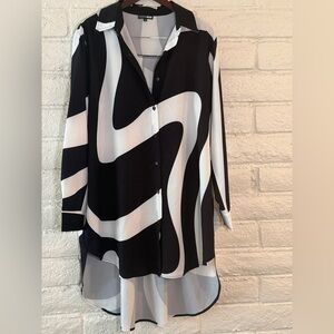 Chic button-down shirt dress with bold abstract pattern. Long sleeves and flowing design. Ideal for stylish outings.
