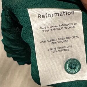 This Reformation dress is a size 2 and measures approximately 41” in total length and 12” lying flat around the waist. It has an invisible zipper and single button closure and is lined.