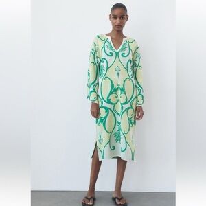 Chic long sleeve dress with green and cream pattern. Perfect for stylish outings.