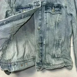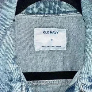 This is a pre-owned Old Navy denim jacket in size M. It is made of a light blue denim fabric and features a classic jean jacket design with a button-up front, two chest pockets, two front pockets, and long sleeves. The jacket has distressed detailing with several small holes and tears throughout. The jacket is in good condition with no major flaws or stains. The tag indicates it was made in Bangladesh.