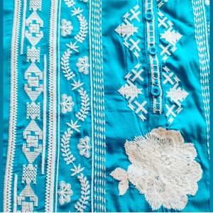 This beautiful 3/4 sleeved top is made of 100% rayon in a non-sheer woven texture. The pretty embroidered patterns on the front are lovely, and it has a series of buttons at the neck. You can roll the sleeves and keep them shorter with button tabs. The back is left solid white, with some gathering near the top. The 3/4 length ROLL TAB sleeves look great any time of year. It has a loose, relaxed fit, making it a nice choice for an everyday top or 👙 swim coverup!