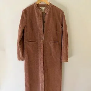 Vintage Orvis corduroy duster in a rich clay tone. Minimalist silhouette with mandarin/band collar, warm brown button front, and subtle patch pockets. 100% cotton corduroy with great texture. Easy layering piece—works over dresses or with denim. Good vintage condition, some light wear. Fits in a Western, cottagecore, prarie, and minimalist closet! Super versatile.