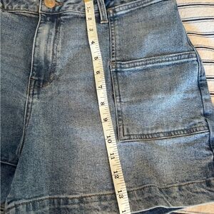 Chic light blue denim shorts. Features front pockets and button closure. Ideal for casual wear.