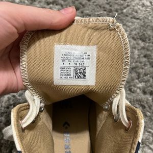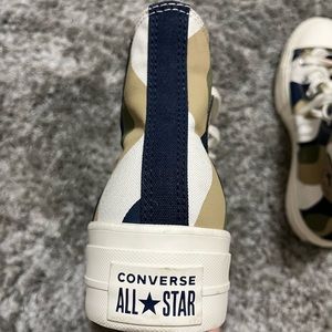 Stylish high-top sneakers with a unique multicolor design. Features a mix of navy, beige, and white. Iconic Converse logo on the side.