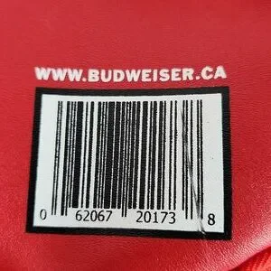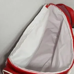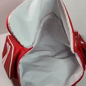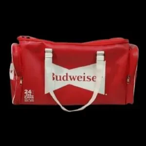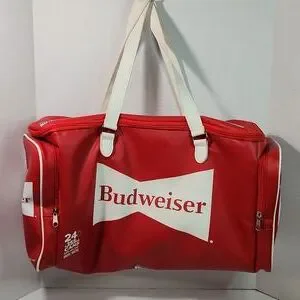 Budweiser Soft-sided Faux Leather Red Cooler Bag. Features 2 zip end pockets, top zip closure, waterproof lining, dual faux leather handles.
