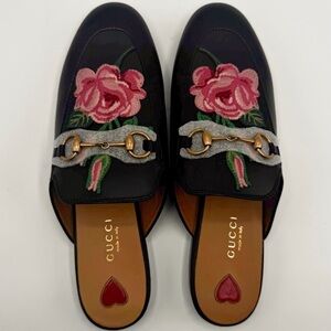 NEW Gucci Leather Floral Rose Embroidered Princetown Horsebit Mule Loafer Slides