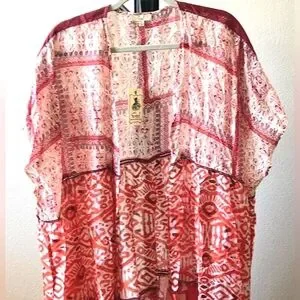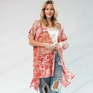 Vibrant orange and white floral bohemian kimono from easel. Tiered, oversized patchwork kimono with mixed red print patterned panels. Lightweight and stylish. Perfect for layering.