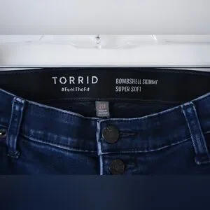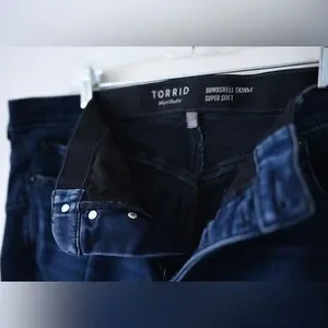 Chic dark blue skinny bombshell jeans. Torrid size 22 Tall, High-rise fit. Bombshell jeans also feature torrid’s amazing compression band around the midsection. Perfect for casual wear.