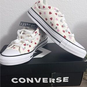 Charming Converse sneakers for Adult. Features red heart design on cream canvas. Stylish and fun for any occasion.