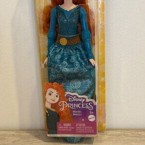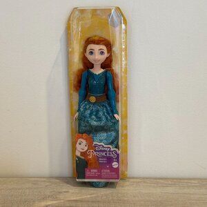 Beautiful Disney Princess Merida doll inspired by the movie Brave. Features long curly red hair, teal glitter dress, and classic princess styling. Comes sealed in original packaging, great for play or display.