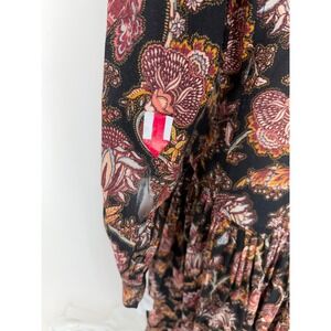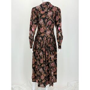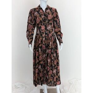 Ulla Johnson midi dress features an intricate floral paisley print in warm earth tones over a dark base. Designed with a classic collar and a button-down front, the silhouette is defined by a dropped waist and a full, pleated skirt that creates elegant movement. The long sleeves are finished with buttoned cuffs, though please note there are significant tears at the sleeve seams as shown in the photos. This piece offers a sophisticated bohemian aesthetic perfect for transitional seasons.