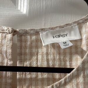 New without tags Hersy gingham romper in a soft neutral beige and white check print. This adorable one-piece features a relaxed fit with a flattering adjustable drawstring waist, short sleeves, and roomy front pockets. Lightweight and breathable, perfect for warm weather and effortless everyday style.