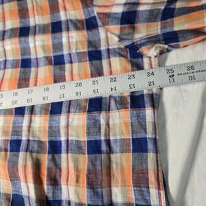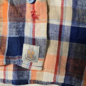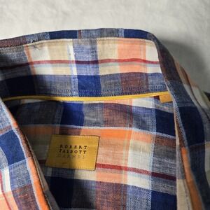 The Robert Talbott Carmel Shirt is a stylish and high-quality addition to any man's wardrobe. Made from 100% linen, this long sleeve button-up shirt features a classic large plaid pattern in multicolor. The collared neckline and regular fit make it perfect for casual occasions or travel, while the garment care instructions advise to dry clean only. With its vintage appeal and brand name reputation, this shirt is a versatile and fashionable choice for the warmer seasons of summer, fall, and spring. Cleaned according to manufacturer recommendation. Measurements and condition are shown in photos. Non smoking home.