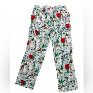 Cozy Vera Bradley pajama pants featuring the rare, retired Ski Slope Snoopy Peanuts print. Adorable winter scene with Snoopy, Woodstock, ski lifts, Christmas trees, and snowy cabins. Made from ultra-soft cotton with an elastic waistband and relaxed fit for comfort. Size Small.