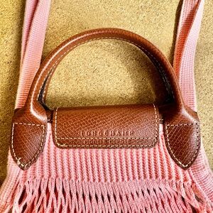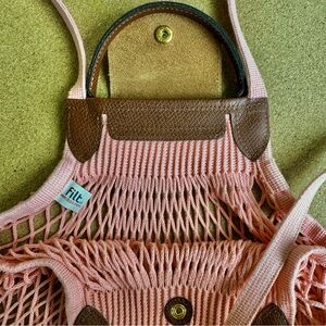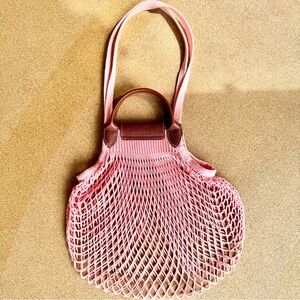 Color sold out everywhere. Authentic Longchamp Le Pliage Filet tote in large size, light pink (Rose). Classic net tote with leather handles and flap closure.