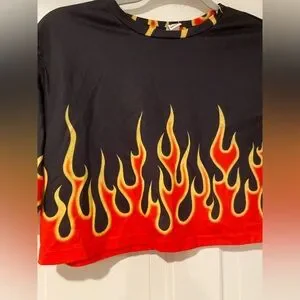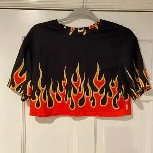 Make a bold statement with this flame-print cropped tee! Features a striking yellow and red flame graphic on black, with matching flame trim at the neckline. Made of soft, stretchy fabric that moves with you — perfect for dance, streetwear, or layering.