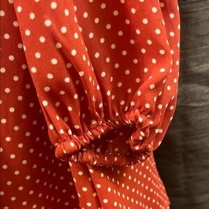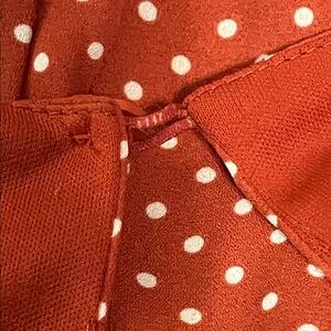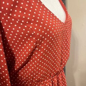 Chic red dress with playful polka dots. Features long sleeves and a flattering fit. Ideal for casual outings. The loop closure is a little stretched.