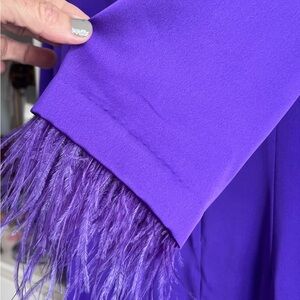 Chic long sleeve dress in vibrant purple. Features stylish feather accents on sleeves. Perfect for elegant occasions.