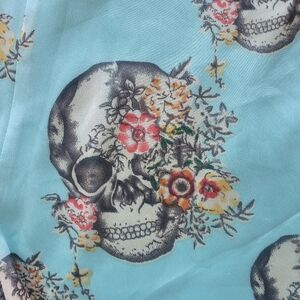 Collectif Violet Skull Chiffon Dress, GUC, Size 12. A couple of runs in the fabric that likely wouldn't be noticed when worn, and waist belt not included. Hard to see the fabric tag, but it is a polyester.