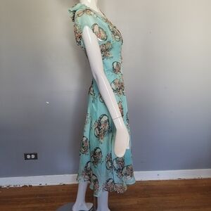 The delicate Violet Skull Print Dress from Collectif is a knee-length, A-line chiffon dress in mint green with a skull and flower pattern in muted colors.