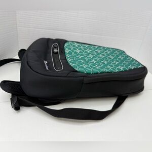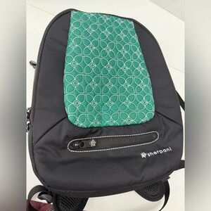 Chic Sherpani backpack with quilted green panel. Black sides and front zipper pocket.