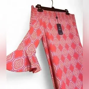 Elegant pink midi dress with white patterns. Features flared sleeves and tassel hem. Perfect for casual outings.