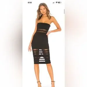 Chic black midi dress with sheer stripe accents. Strapless design for a modern look.