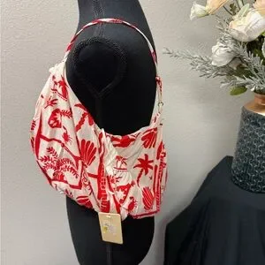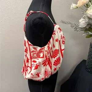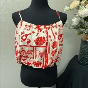NWT Peach Red Cream Shell Print Crop Tank Top Button Detail Resort Summer M