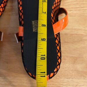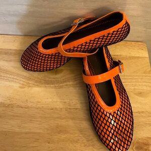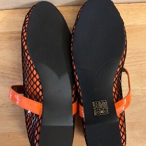 • • Design: These Mary Jane style flats feature a classic round toe, an all-over black "fishing net" mesh upper, and a glossy orange patent leather trim with a matching, adjustable buckle strap. The insole is brown.