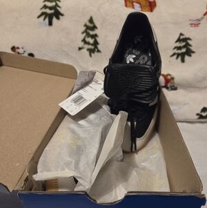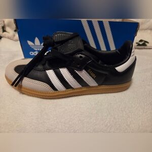 Stylish Adidas Samba sneakers. Features black and white design with tan sole. Ideal for everyday comfort and style.